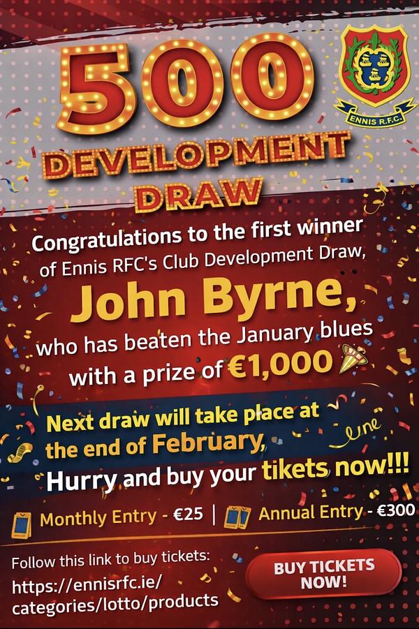 Congratulations to the first winner of Ennis RFC’s Club Development Draw, John Byrne, who has beaten the January blues with a prize of €1,000 🎉 Next draw will take place at the end of February.